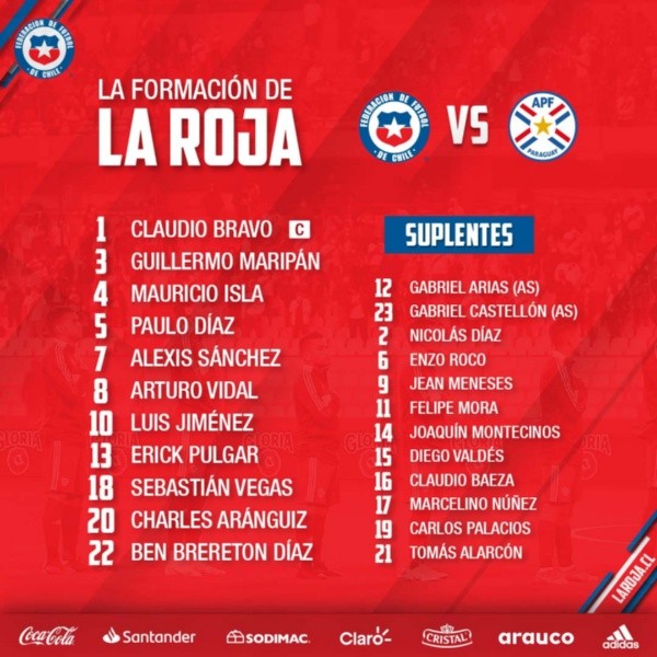 Seleccion Chilena On Twitter Formacion Asi Laroja Saldra A Buscar El Triunfo Frente A Fcfseleccioncol Vamoschile Https T Co Vfs0zd1mbe